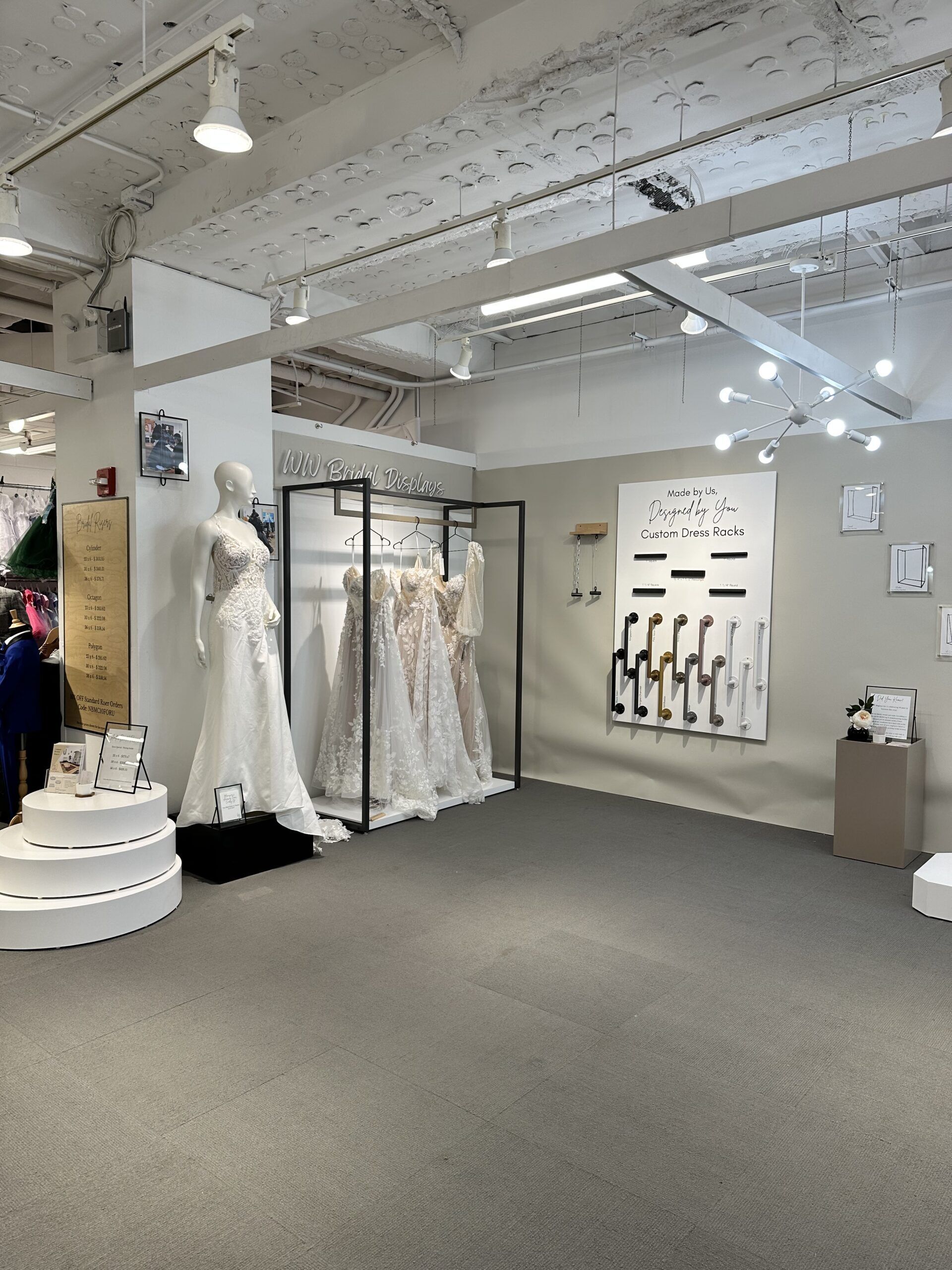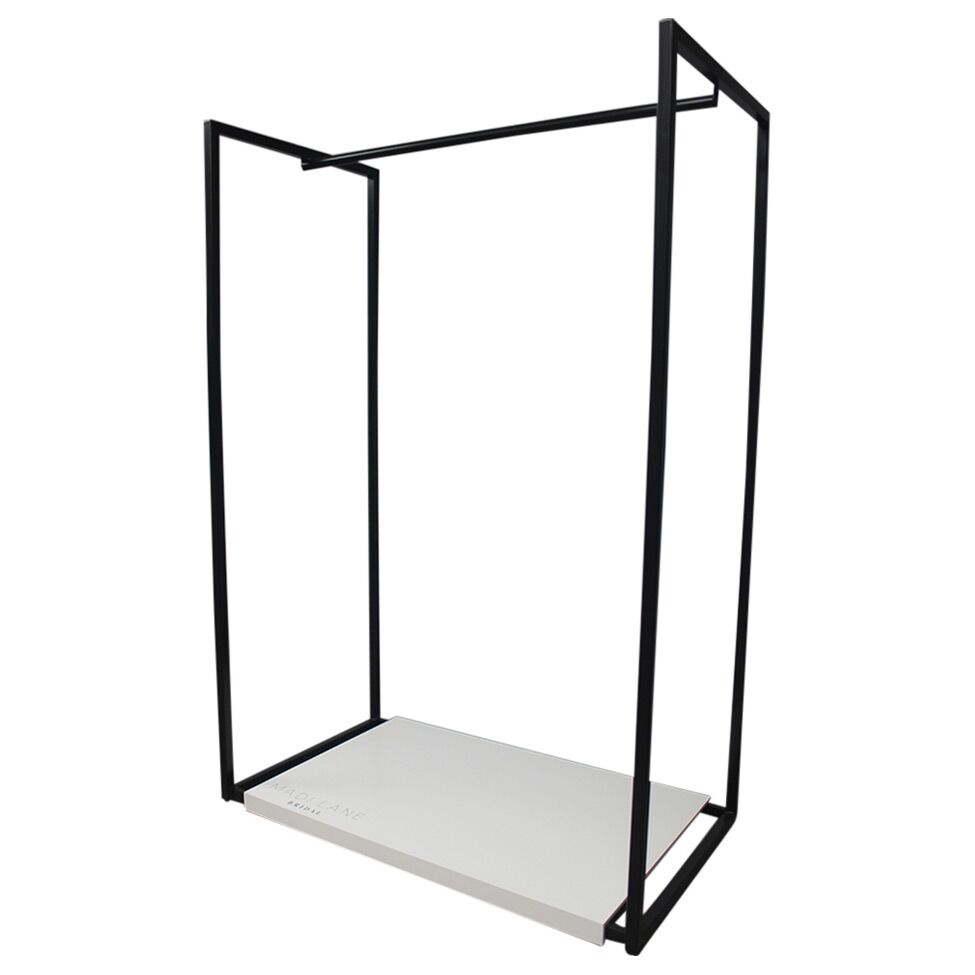 A modern free standing dress rack perfect to show off your unique line of dresses. Light weight, sturdy and beautiful. It even comes with white wood base cover to prevent the dresses from catching any stray dust bunnies! Looking to cover a larger space with this design? We offer this in extended lengths- add on capabilities.
