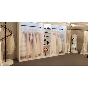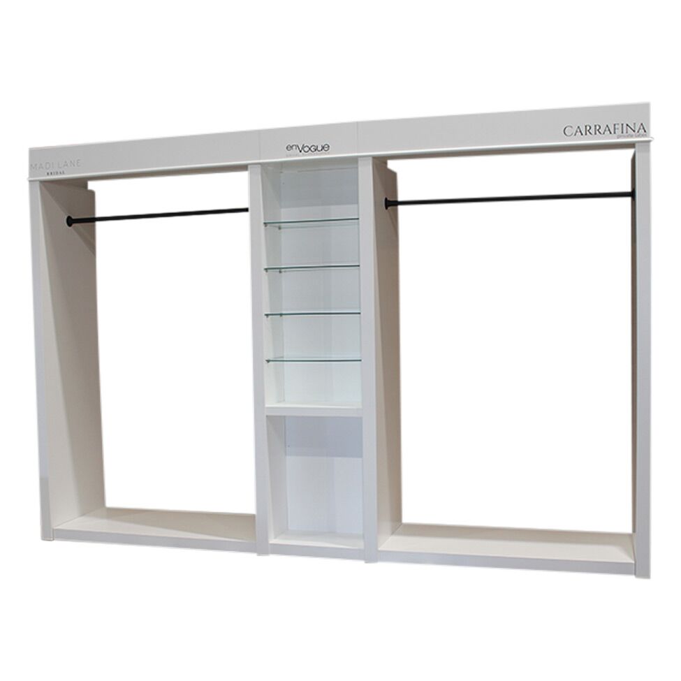 The perfect wall anchored "built in" design for a luxury look. Combining two 5ft dress racks with a 22" accessory unit, this is the perfect unit to showcase your finest gowns and accessories. Complete with LED dim-able lighting and key fob for easy on and off it will be hard not to be drawn to all the sparkle and shine!
